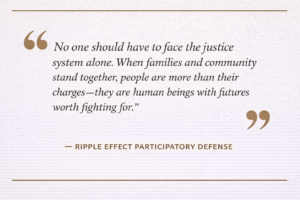 One partner that embodies this kind of unity is Ripple Effect Participatory Defense, led by Elias Williams and Melinda Williams. Their work centers people who are often invisible in the criminal legal process, ensuring that justice involvement does not automatically cut individuals off from opportunity, care, and community.